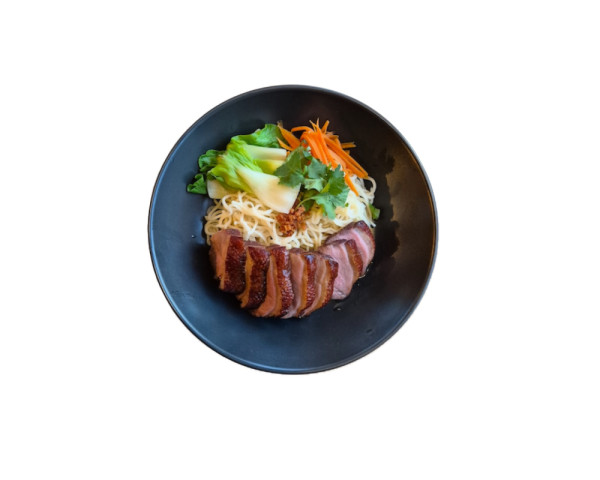 บะหมี่เป็ดย่าง | Velmi oblíbený street food z Bangkoku inspirovaný čínskou kuchyní. Kachna je připravená metodou Sous Vide (šťavnatá a růžová uvnitř) a podávaná s vaječnými thajskými nudlemi, tajnou asijskou omáčkou a zeleninou Phak Choi, mrkví a koriandrem.