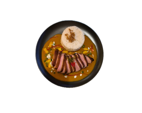 แกงพะแนงเป็ด | Velmi oblíbené lehce pikantní thajské kari Panang s kokosovým mlékem, kachním masem připraveným metodou Sous Vide (šťavnatá a růžová uvnitř), kafrovým listem, paprikou, cuketou, hráškem a cherry rajčátky. Podáváno s thajskou jasmínovou rýží.
