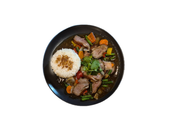 ผัดพริกไทยดำเป็ด | Jasmínová rýže s kachnou připravenou metodou Sous Vide, thajskou pepřovou omáčkou, zeleninou, houbami a koriandrem.