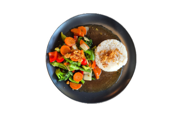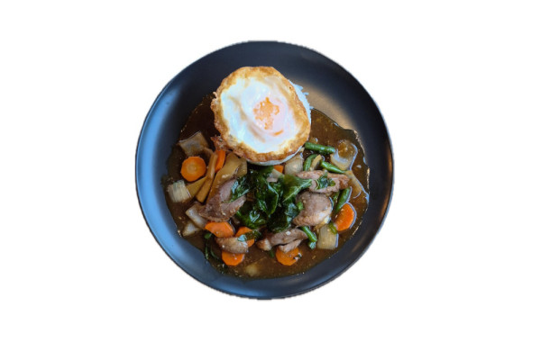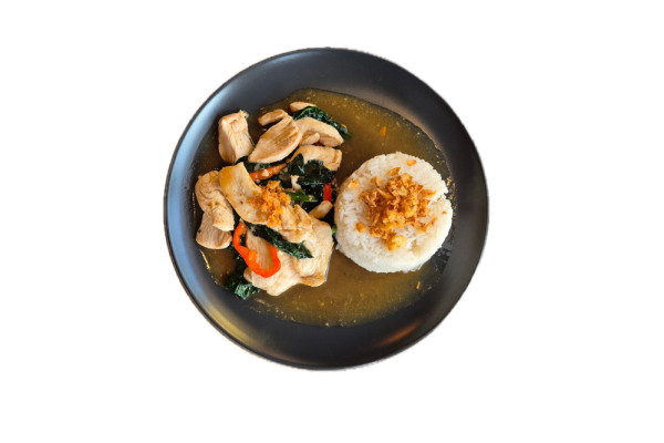 kuřecí nebo hovězí maso nebo tygří krevety nebo tofu, chilli, bazalka, zelenina, česnek, sojová omáčka, ústřicová omáčka, bambusové výhonky, jasmínová rýže, vejce
