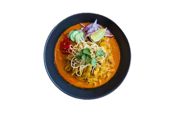 široké rýžové nudle, kuřecí maso, červené kari, kokosové mléko, vejce, fazolové klíčky, mrkev, pórek, arašídy, limeta, koriandr